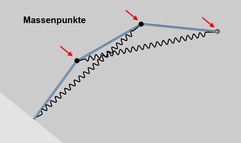 - Federn zwischen jedem Massenpunkt (da sich diese nicht variieren lassen).In den Massenpunkte ist die Masse der Guides konzentriert.
