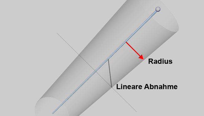 Dieser Radius symbolisiert einen imaginären Schlauch um jeden Guide, in dem eine Kraftwirkung mit einstellbarer Abnahme auf andere Guides/Haare wirkt.