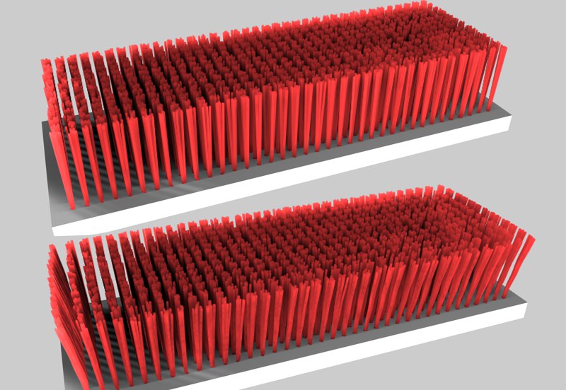 Wenn Sie sich beispielsweise den Besen auf der Tab Haare Seite betrachten, stehen die Guides unrealistischerweise senkrecht nach oben. Um die Guides jetzt etwas auseinanderzutreiben, aktivieren Sie die Option Starr im Tab Dynamics und die Option Haar auf Haar hier im Tab. Wenn Sie die Dynamics jetzt wirken lassen, erhalten Sie folgendes Ergebnis: