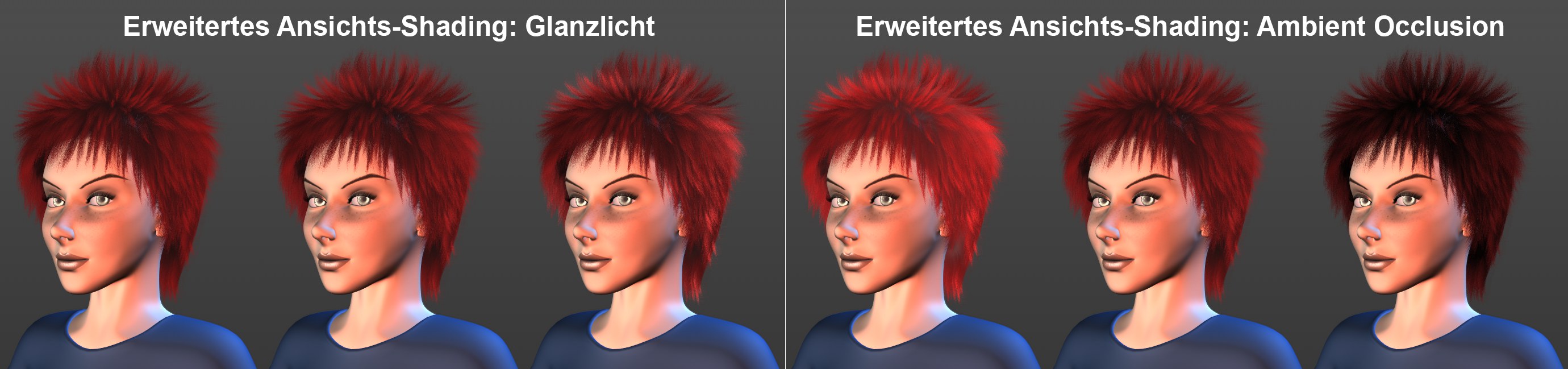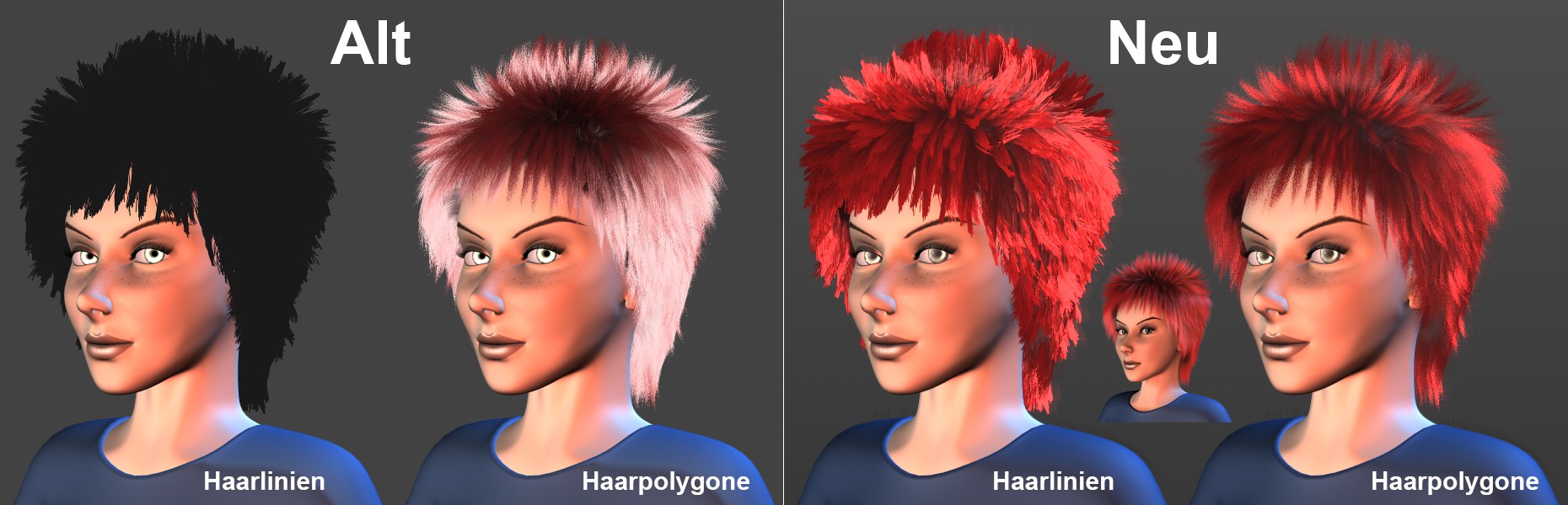 Speziell für die Ansicht (und damit auch für den Ansichtsrenderer) wurde ein vereinfachtes, schnelleres Haar-Shading-Modell integriert, dass sich im Wesentlichen durch die weiter unten beschriebenen, beiden Einstellungen kontrollieren lässt. In den beiden Modi AnzeigeHaarlinien und Haarpolygone ist jetzt wesentlich bessere Qualität möglich (u.a. gehorchen die Ansichtshaare auch auf das in den Programmvoreinstellungen definierte Antialiasing).
