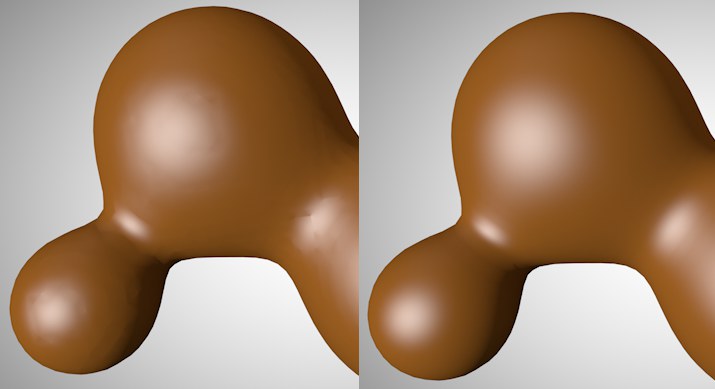 Bei aktivierter Option werden intern akkurat berechnete Vertex-Normalen verwendet, die in den meisten Fällen ein gleichmäßigeres Shading ermöglichen. Beachten Sie, dass Sie das Metaball-Objekt danach nicht verformen können, da dann die Vertex-Normalen nicht mehr stimmen.