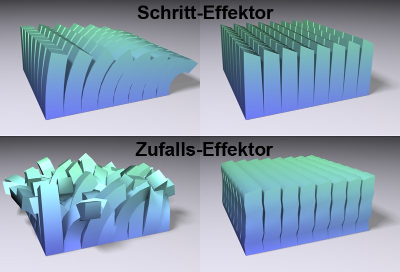 Intern wird entlang der Extrusion eine Reihe von mehreren (entsprechend der Extrusionsschritte) Klonen erzeugt. Die Effektoren wirken dann entlang der Extrusion.