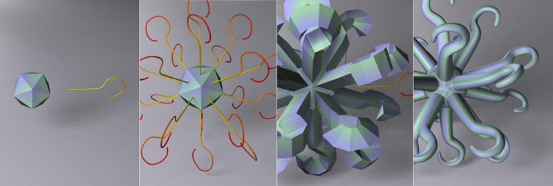 Dieses nur für den Modus Von Wurzel einladbare Spline sorgt dafür, dass jede Extrusion entlang eines frei wählbaren, hier zu definierenden Splines erfolgt. Dabei werden intern Kopien des Splines an jedem Polygon angelegt und zwar dergestalt, dass die ersten beiden Splinepunkte in Richtung der Oberflächennormale zeigen. Die Extrusion erfolgt dann entlang dieser vrituellen Splinekopie. Beachten Sie auch hier die Splineunterteilung (s. Grundlagen) und die Anzahl der Extrusionsschritte, da beide Einfluss auf die Extrusion haben.