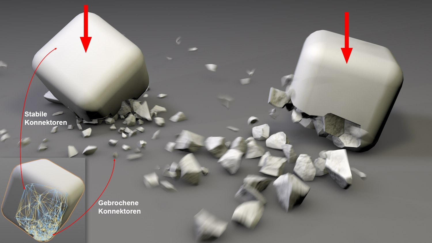 Beachten Sie, dass die Wichtungs-Maps auch nach Beginn einer Animation noch per XPresso oder Abnahme- Objekt geändert werden können. So können z.B. im Laufe der Animationen Konnektoren geschwächt werden, damit sich dort weitere Brüche ergeben.