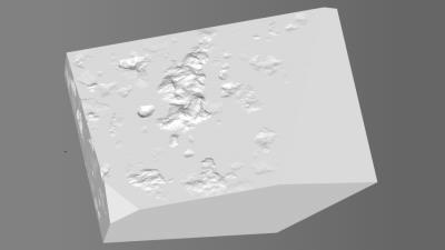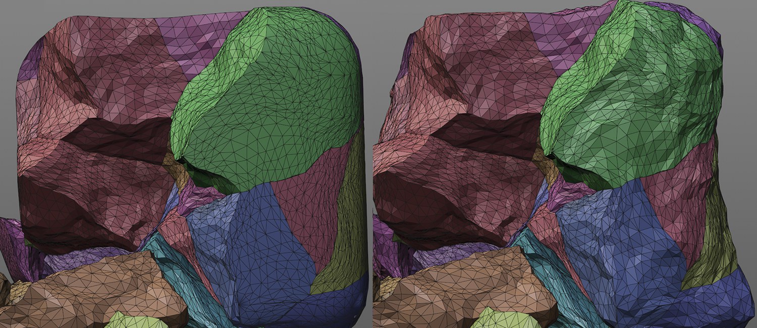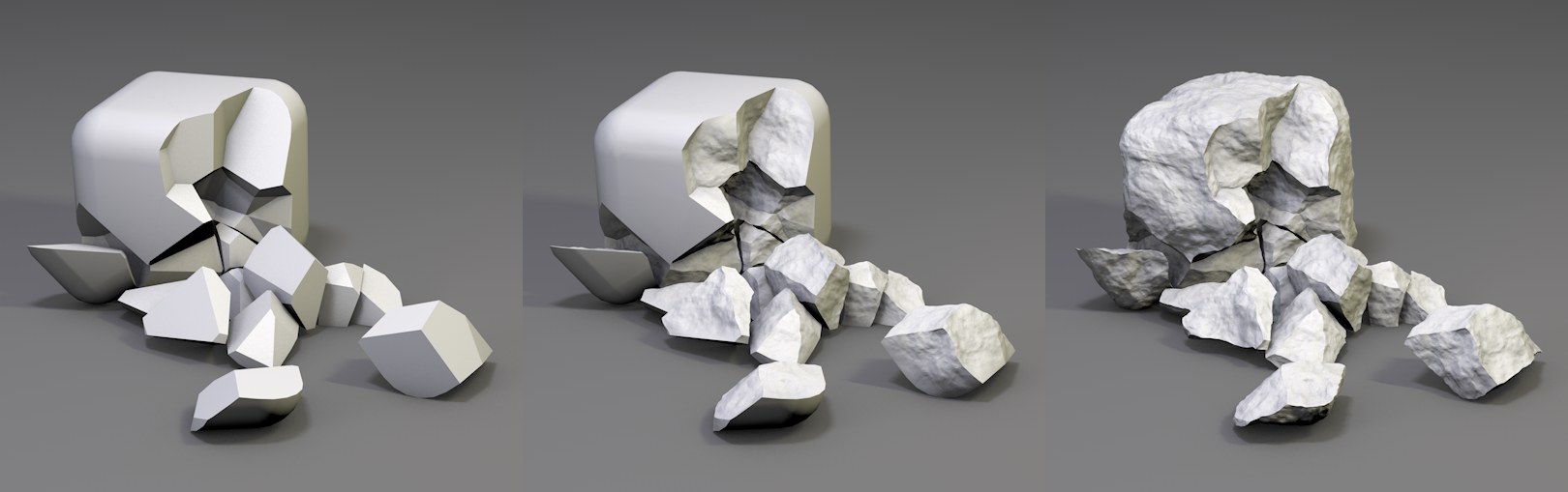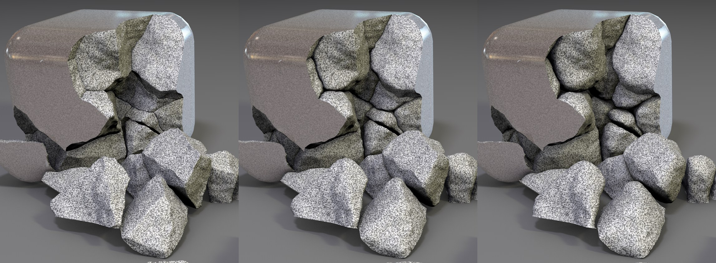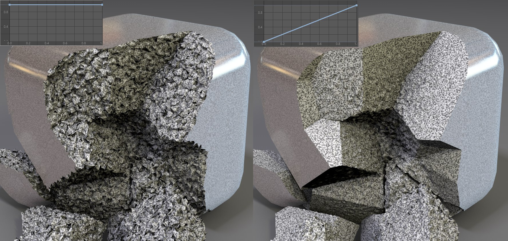 Mittels dieses Parameters können die inneren Bruchkanten abgerundet werden. Je größer der Wert, desto runder erscheint das Fragment. Das Fragmentvolumen wird dabei kleiner (ohne Außenkanten bis zum Verschwinden) und die Fragmente passen nicht mehr lückenlos zusammen.