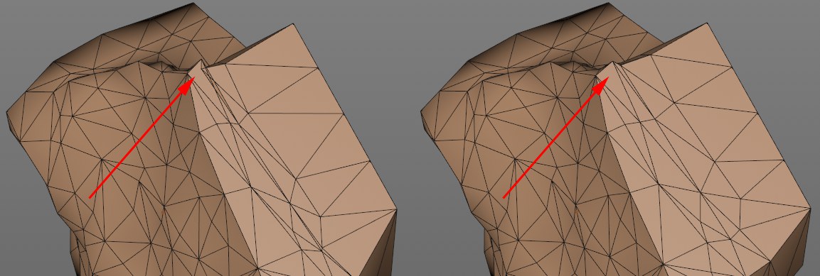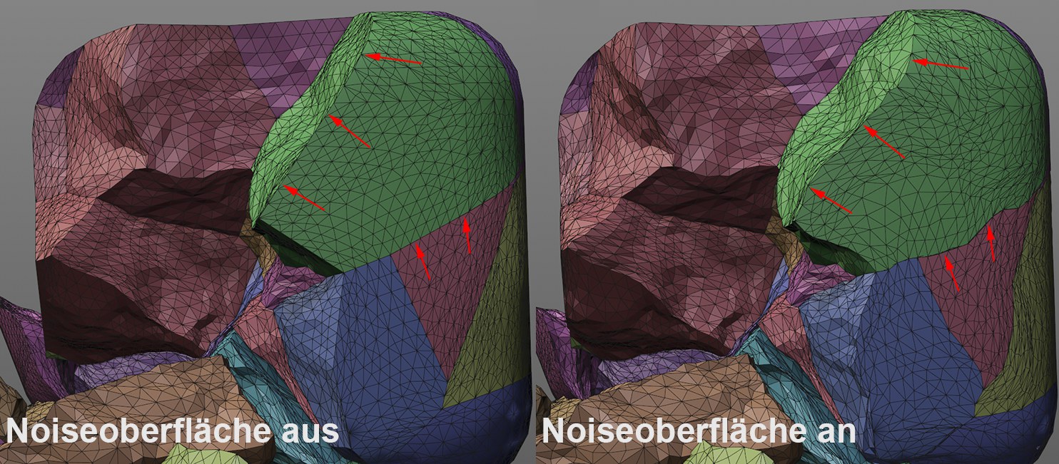 Bei aktivierter Noiseoberfläche wird das Mesh auf der Fläche der ursprünglichen Außenform (und darüber hinaus) verzerrt. Dabei kann es zu Shadingfehlern kommen, wenn sich Polygone überschneiden. Wenn Sie hier jetzt höhere Werte einstellen, nähern sich die Punkte in Bruchkantennähe zunehmend an die ursprüngliche (Phong-)Bruchkante an, was hilft, genannte Fehler zu minimieren.