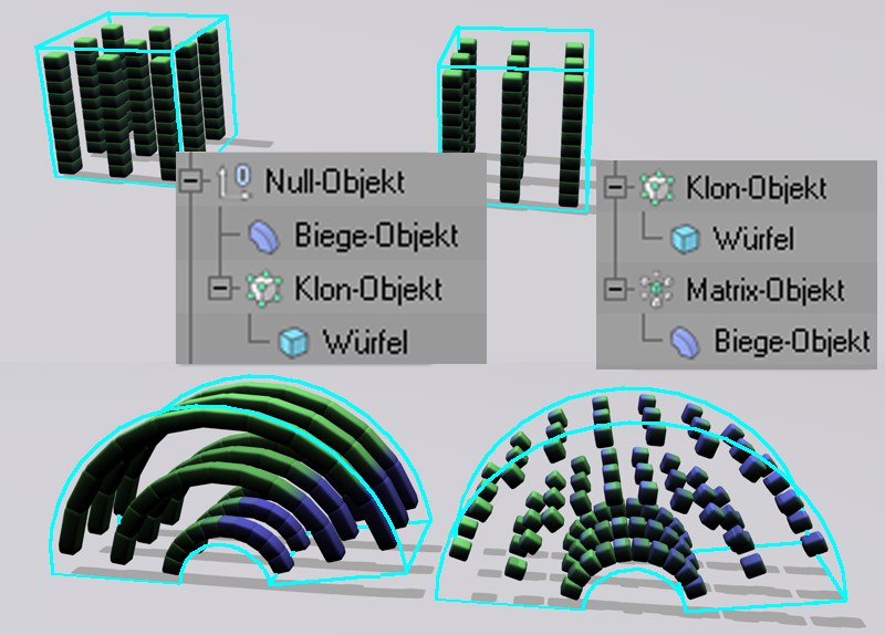 Wie Sie hier sehen, eine Menge. Hier wirkt ein Biege-Objekt (s. Biegen) jeweils auf eine Klonansammlung. In beiden Fällen ist die Wirkung auf Position und Ausrichtung der Klone gleich. Jedoch werden ohne Matrix-Objekt die Klon-Geometrien verzerrt, was in den seltensten Fällen gewünscht ist. Wirkt das Deformations-Objekt auf das Matrix-Objekt, werden nur Position und Ausrichtung der Klone verändert, wohingegen keinerlei Geometrieverzerrung erfolgt.