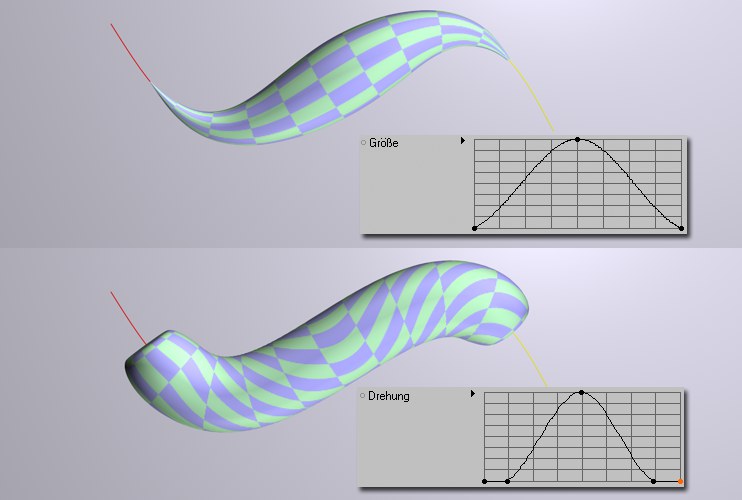 Mit diesem Funktionsgraphen definieren Sie die Größenänderung des verformten Objekts über die Splinelänge, d.h. wenn sich das Objekt per Offset-Variierung entlang des Splines bewegt, ändert sich die Größenverteilung bzgl. des Objekts dynamisch.
