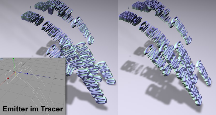 die Splines werden vom Tracer mit Hilfe eines Emitters erzeugt. Im linken Teil der Abbildung sehen Sie, wie
