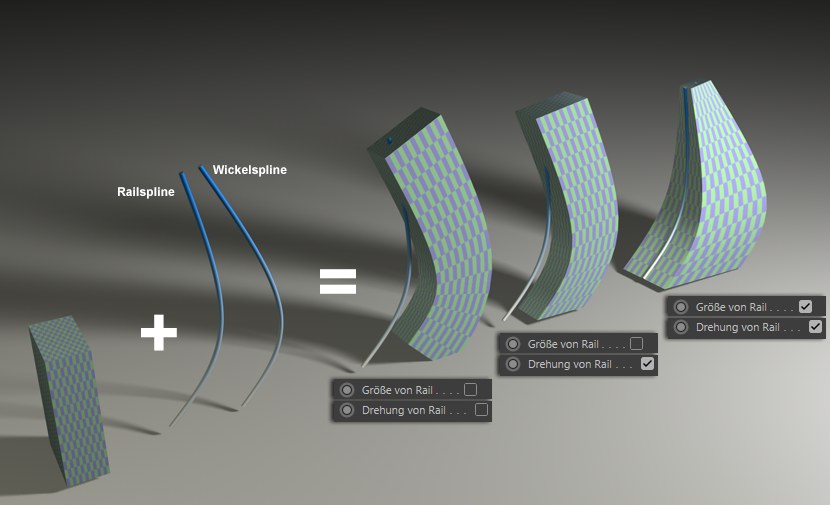 Ist diese Option aktiviert, richten sich die Punkte, die auf senkrechten Ebenen zum Wickelspline liegen entsprechend aus, d.h. die (gedachten) Ebenen zeigen auf die entsprechenden Railsplinepositionen. Das sehen Sie in vorletzter Abbildung ganz gut: die untere Kante des mittleren verformten Quaders zeigt auf den Railsplineanfang. Ganz im Gegensatz zu dem Quader links daneben: hier liegt die untere Kante auf einer zum Splineanfang senkrechten Ebene.