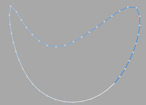Dieser Interpolationstyp unterteilt den Spline so, dass insgesamt Anzahl Punkte pro Stützpunkt verwendet werden. Die Punkte folgen dabei direkt dem natürlichen Verlauf des Splines, d.h. sie liegen an Stützpunkten dichter zusammen als dazwischen. Die Kurve, die aus dieser Interpolation resultiert, geht nicht notwendigerweise durch die Stützpunkte. Besitzt ein Spline mehrere Segmente, dann gilt der Wert für Anzahl für jeden Stützpunkt jedes Segments.