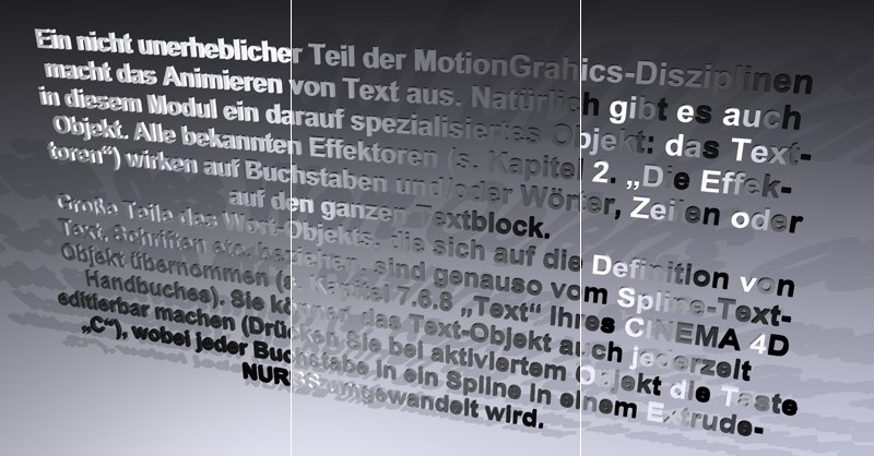Besonders bei deformiertem Text ist damit eine wesentlich bessere Renderqualität möglich. Wenn Sie als Maximale Länge den gleichen Wert wie bei Weite im Extrudieren-Objekt (Tab Deckfläche, Option Regelmäßige Unterteilung aktiviert) eingeben, erhalten Sie ziemlich perfekte Deckflächen und Kanten ohne Shadingfehler, da die Unterteilungen von Buchstaben und ihren Deckflächen zueinander passen und nicht willkürlich Dreiecke eingefügt werden müssen, um beide zu verbinden.