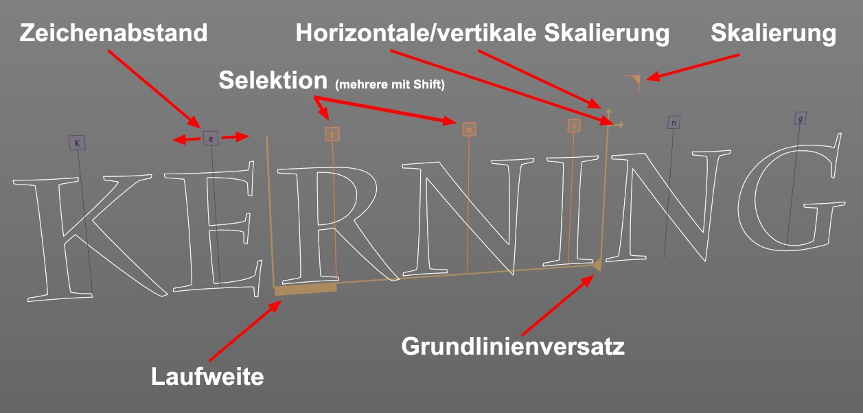 Über jedem Buchstaben finden Sie einen entsprechend gekennzeichneten, quadratischen Buchstabenanfasser. Dieser kann direkt (ohne Selektion) gegriffen werden, um den Zeichenabstand links vom entsprechenden Buchstaben zu regeln. Sie können natürlich auch Selektionen vornehmen: