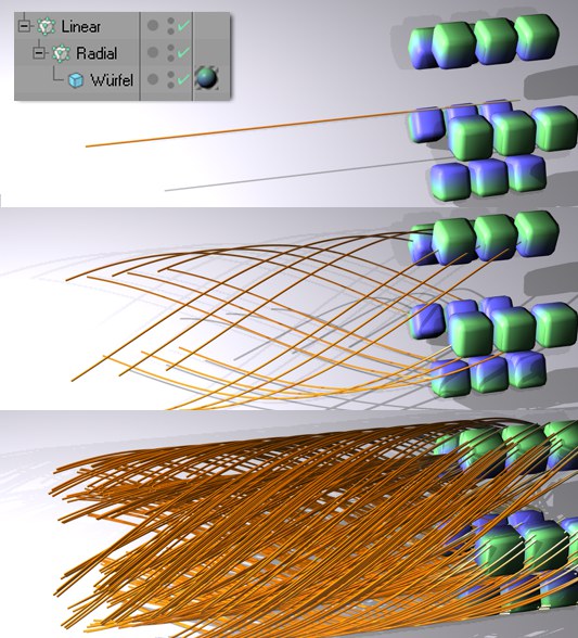 Die Objekte/Partikel (je nach Modus Klon-Objekte behandeln oder getracetem Objekt werden auch Objektpunkte verbunden) von verschiedenen vom selben Tracer getraceten Objekten werden durch einen gemeinsamen Spline, aber mit unterschiedlichen Segmenten verbunden.