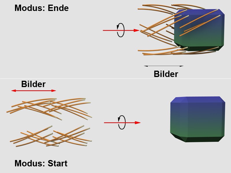 Das sich bewegende Objekt oder Partikel zieht eine Splineschleppe hinter sich her. Die Länge dieser Schleppe geben Sie in Animationsbildern an. Der zugehörige Parameter Bilder wird rechts vom Auswahlmenü eingeblendet.
