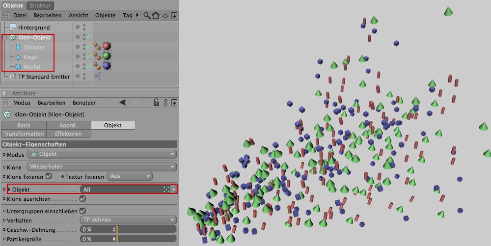Sie müssen dann die zu emittierenden Objekte lediglich dem Klon-Objekt unterordnen.