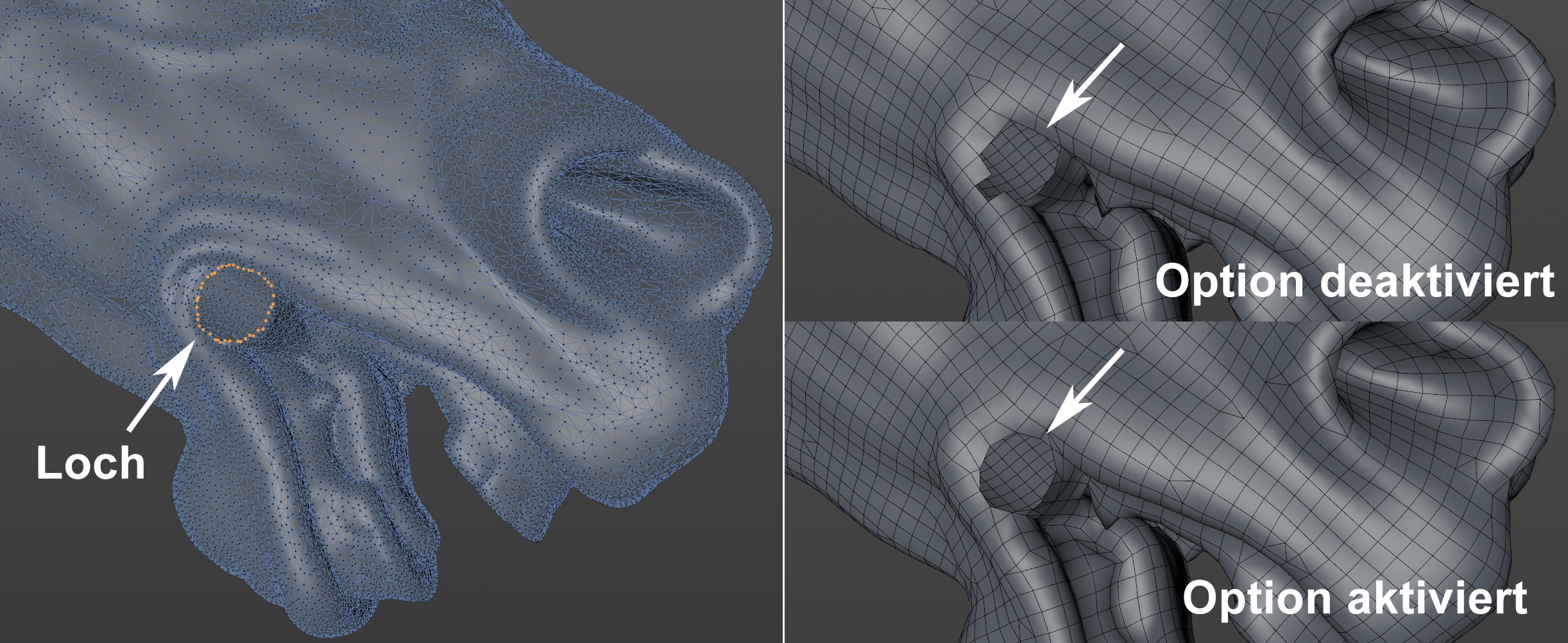 Sollte Ihr Objekt nicht aus einem geschlossenen Volumen bestehen und Ränder oder Löcher aufweisen, kann durch Aktivierung dieser Option die ungefähre Beibehaltung dieses Randes gewährleistet werden. Das funktioniert desto besser, je größer die Meshdichte ist.