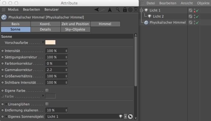 Dieses zweite Licht wird von den Himmel-Einstellungen nicht mehr behelligt, außer dass es als Unterobjekt von Licht 1 dessen Position folgt.