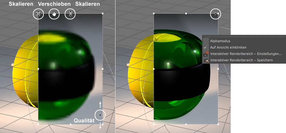 Der IRB kann mit den eingeblendeten und oben in der Abbildung markierten Anfassern skaliert und verschoben werden. Am rechten Rand des IRB finden Sie einen dreieckigen Slider, mit dem Sie die Renderauflösungsqualität variieren können. Wie immer gilt: Je besser die Qualität, desto größer auch die Renderzeit.