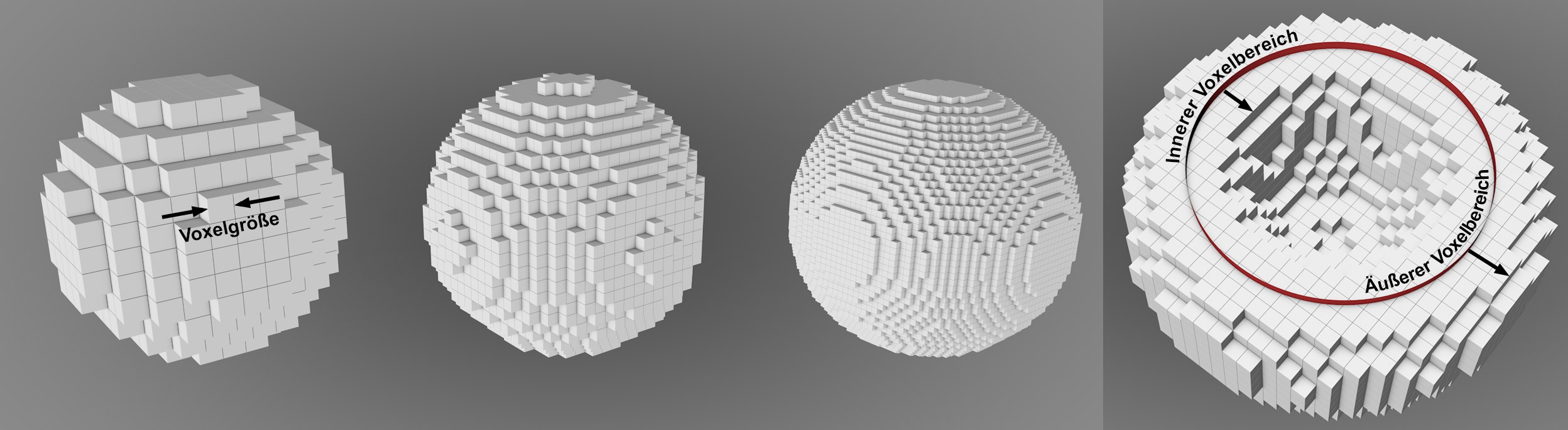 Linker Teil: je kleiner die Voxelgröße, desto genauer kann die Form (hier eine Kugel) nachgebildet werden. Rechts: