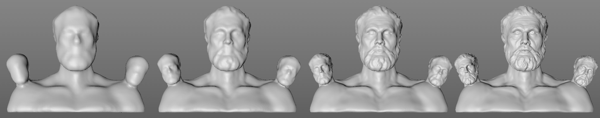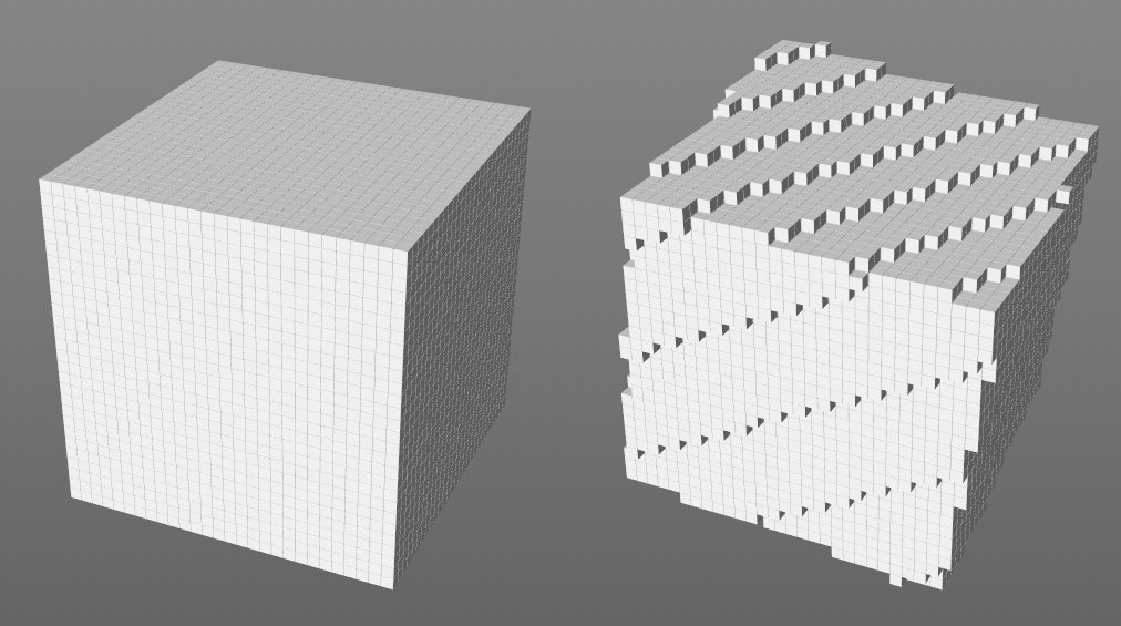 Wenn der Volumenmesher aus den Voxeln ein Mesh erzeugt, kann es zu Artefakten bei der Interpolation kommen. Stellen Sie sich z.B. 3 Würfel unterschiedlicher Position vor. Je nach Position kann die Kante eines Würfels sehr scharf sein, weil die Kante genau auf der Grenzfläche zweier Voxel liegt, während sie bei einem anderen Würfel abgerundet erscheint, weil sie mitten durch ein Voxel läuft. In solchen Fällen kann es sinnvoll sein, die vorgegebene Gittermatrix zu überschreiben, um beide Kanten abzurunden.