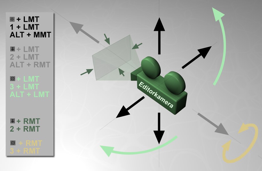 Als Sonderfall gilt: die Kamera dreht – wenn diese in die Ansicht eingeklinkt UND aktiviert ist – unabhängig vom hier definierten Kameramodus um ihren Ursprung.