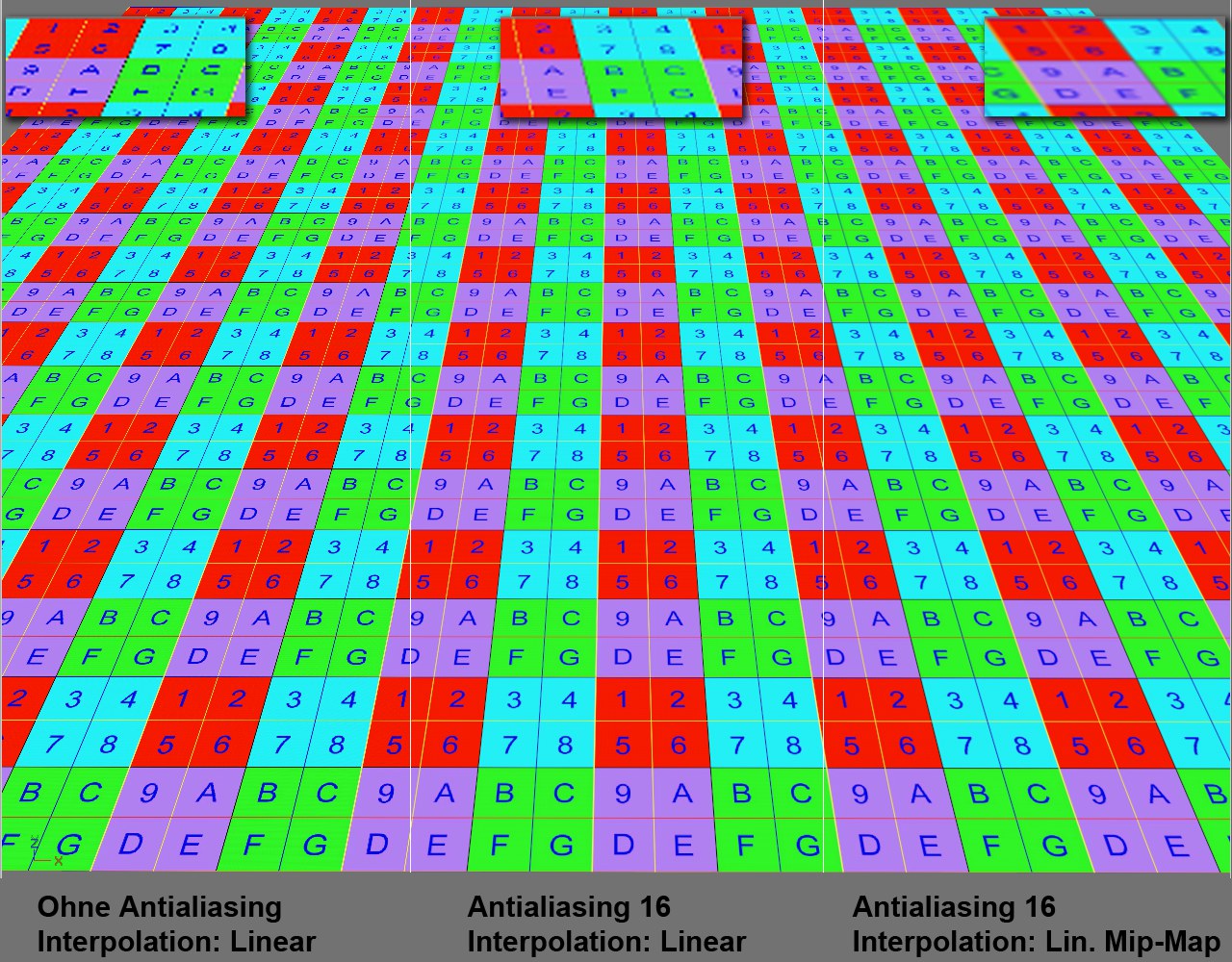 Mit diesem Auswahlmenü stellen Sie die Antialiasinggüte ein, die im Editor während der Arbeit (nicht des Renderns!) angezeigt wird. Höhere Werte ergeben eine bessere Qualität. Besonders im Zusammenhang mit der Option Lineares Mip-Map lassen sich hier sehr gute Texturdarstellungsqualitäten erreichen.