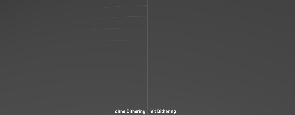 Bei der Darstellung von sich langsam ändernden Helligkeitsverläufen kommt es oft zu sichtbarem "Banding" (passiert z.B. bei obiger Abbildung beim Übergang von RGB 69, 69, 69 auf 70, 70, 70). Durch das sog. "Dithern" (änderndes Rastern im Bereich) kann der harte Farbübergang visuell aufgelöst werden.
