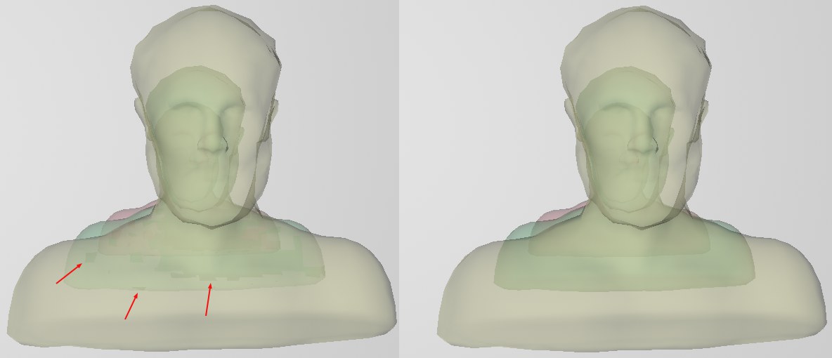 Der Wert gibt an, wie viele Transparenz-Ebenen richtig gezeichnet werden. Sollte es bei mehreren hintereinander liegenden Objekten mit verschiedenen, transparenten Materialien zu Fehlern in der Darstellung kommen, so können Sie den Wert auf Kosten der Rechengeschwindigkeit erhöhen: