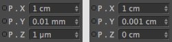 Hiermit werden lediglich die in den entsprechenden Feldern angezeigten Einheiten umgestellt. Die Werte werden dabei umgerechnet. Stand vorher dort "3 cm” und Sie stellen auf Meter um, wird in dem Feld danach "0.03 m” stehen (oder beispielsweise 0.033 yd). Diese Einstellungen haben auf die Szene selbst keine weiteren Auswirkungen, sondern dienen ausschließlich der Einheitenanzeige in den Wertefeldern.