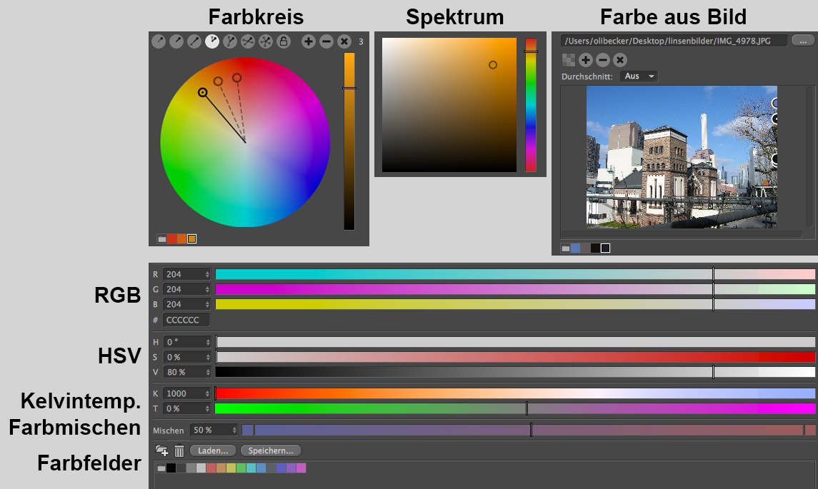 Details zur Farbwählerbedienung, Farbharmonien und mehr, finden Sie unter Farbwähler.