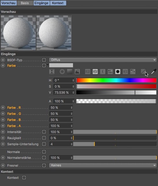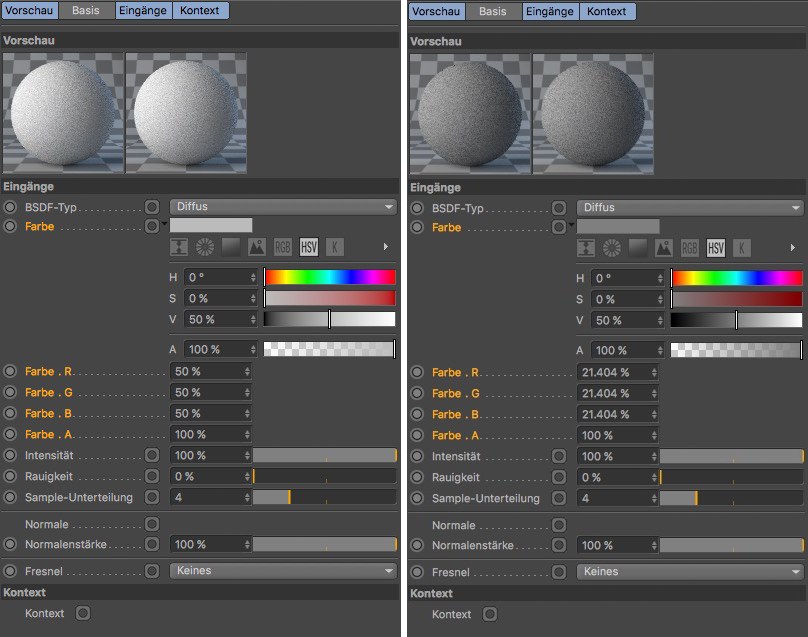 Die Darstellung der Helligkeit im Vorschaubereich des Farbwählers erfolgt jedoch dank des Linearen Workflows linear, also optisch für uns heller als eigentlich mit 50% Grau angenommen.