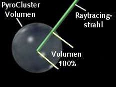 Um zu verstehen, wie PyroCluster volumetrische 3D-Effekte erzeugt, lesen Sie am besten die Seiten über den Volumen-Tracer. Die Illustration unten zeigt, was der Volumen-Wert genau ist.