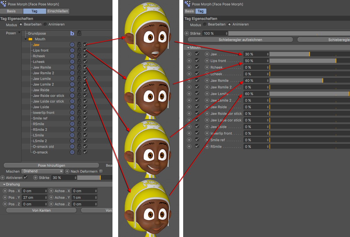 Es können sogar gleiche Morphtypen zu separaten Pose-Morph-Tags gehören. Damit können Sie beispielsweise ein normales Gesichtsmorph in einem Tag zu speichern und ein Korrekturmorph in einem anderen Tag.
