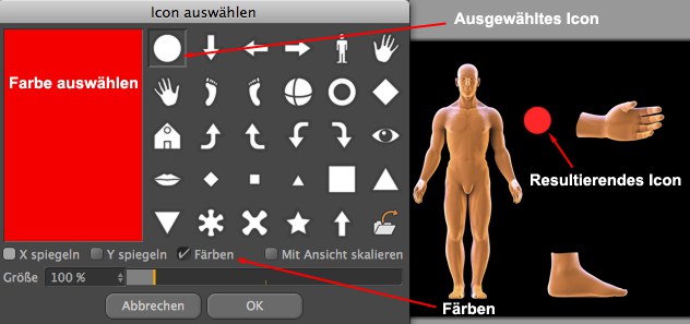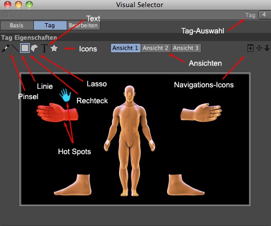 In diesem Modus können einige ausgewählte Presets (wählen Sie dazu den Modus aus und klicken Sie an die entsprechende Stelle) oder auch eigene Icons als Hot Spots verwendet werden. Ebenso können Icons, die durch Drag&Drop von Objekten aus dem Objekt-Manager hier gelandet sind, bearbeitet werden.