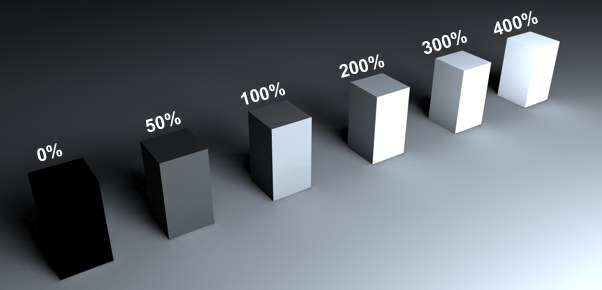 Beachten Sie, dass bei Werten unter 100% je nach Objektbeschaffenheit kein Effekt festzustellen ist, da dort unter Umständen (flaches, ebenes Objekt) schon minimale Sampledichte berechnet wurde. Anders sieht das bei zerklüfteten Objekten mit Ecken und Kanten aus, hier lässt sich die Eintragsdichte dann durchaus mittels kleinerer Werte verringern.