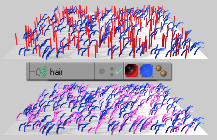 Ist die Option deaktiviert, wirkt das aktuelle Tag – allerdings abhängig von seinen Einstellungen – mit seinem Haarmaterial grundsätzlich auf alle Haare. Das sehen Sie in obiger Abbildung unten, wo die lilafarbenen Haare von beiden Tags gleichzeitig beeinflusst werden.