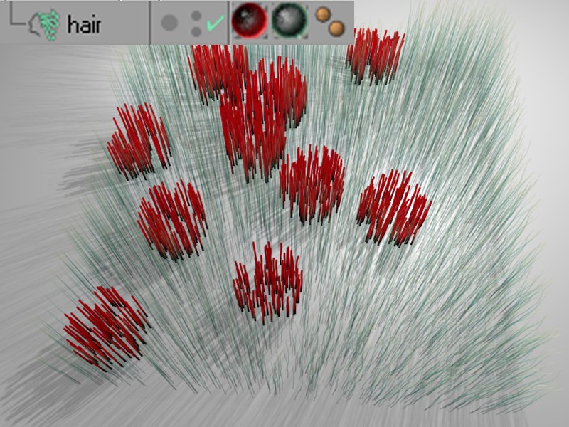 Andere Parameter wie Haardicke vergrößern sich nicht in ihren Auswirkungen. Hier wird vielmehr, abhängig von Mischen, einfach übergeblendet: Gibt das erste Haarmaterial eine Dicke von 1m und das zweite eine von 10m vor, bewegt sich die gerenderte Haardicke dann nur zwischen 1m und 10m.