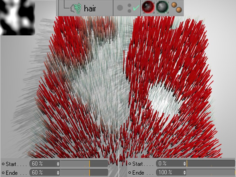 Wenn Sie Textur auswählen, können Sie über die Graustufenverteilung der Textur definieren, welche Haare für dieses Tag herausgepickt werden. Mit den beiden Parametern Start und Ende schränken Sie die Graustufen und damit die herausgepickten Haare ein. Damit können Sie zwischen vorherigem Tag und diesem Tag weich überblenden (bei 0 und 100 für die beiden Parameter). Wenn Sie keine weiche Überblendung wollen, stellen Sie Start und Ende auf den gleichen Wert. Gibt es kein vorheriges Tag (also kein Haar-Material Tag, das links daneben im Objekt-Manager liegt), wird mit dem blonden Standard-Haarmaterial übergeblendet.