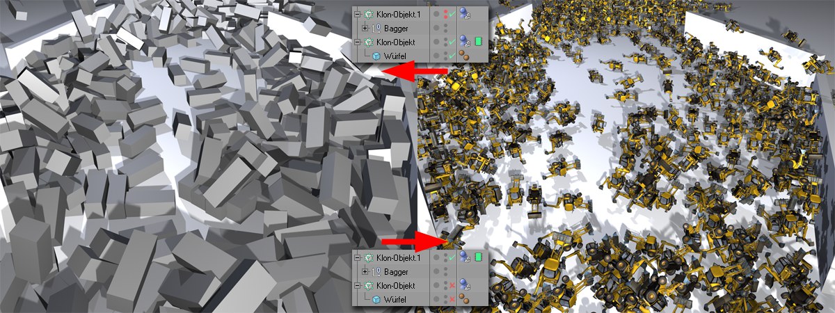In folgendem Beispiel wurde mit Würfeln (links) eine Simulation gebacken und das resultierende MoGraph-Cache-Tag einem gleichartigen Klon-Objekt, das einen aufwendigen Bagger klont, zugewiesen:
