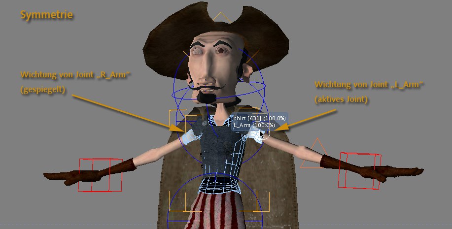 In diesem Modus wird für die Symmetrie die Wichtung des ausgewählten Joints der Wichtung eines anderen Joints zugeordnet, also zum Beispiel die Wichtung des linken Oberarms der des rechten Oberarms. Für diese Zuordnung wird der Name der Joints verwendet. Damit das Werkzeug die jeweils richtigen Joints benutzt, können Sie in den Feldern Links und Rechts das von Ihnen bei der Benennung benutzte Präfix oder Suffix eintragen. Heißen Ihre Joints beispielsweise "L_Oberarm" und "R_Oberarm", so geben Sie bei Links einfach "L_" ein und bei Rechts "_R". Sie geben also immer den Teil des Namens ein, der bei beiden Joints unterschiedlich ist. Wenn Sie für alle Joints Ihres Charakters das selbe Präfix oder Suffix verwenden, wird so immer das entsprechende Joint für die Symmetrie gefunden, egal welches Joint Sie gerade aktiviert haben. Sie können die Wichtung des für die Symmetrie gewählten Joints bei der Arbeit im Editor sehen. Das Schöne ist, dass Sie dabei auf beiden Seiten des Charakters arbeiten können.