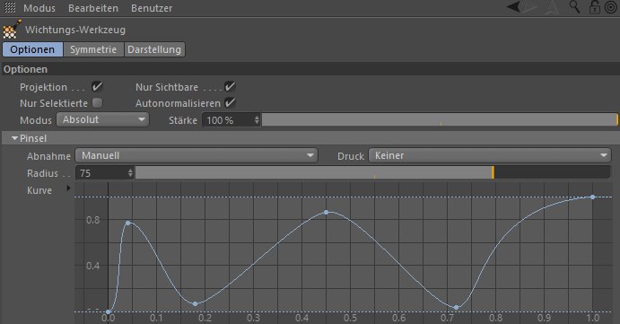 Dieser Modus erlaubt es, die Werte einer bereits gemalten Wichtung neu zuzuweisen. Zu diesem Zweck erscheint zusätzlich eine Kurve, mit der man die Zuweisung einstellen kann. Stellen Sie sich das vor wie z.B. eine Gradationskurve in Photoshop: macht die Kurve etwa einen leichten Bogen nach unten, wird ein Wert, der ursprünglich 50% betrug nach dem Übermalen nur noch mit 40% gewichtet sein, ohne das sich die Werte für 100% oder 0% verändern.