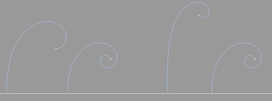 Mit diesen beiden Parametern kontrollieren Sie, wie die unter Tab Locken eingestellten Kurven auf der Guidelänge aufgetragen werden. Bei kleinen Werten wiederholen sich die Kurven öfters, was dann mehr in Richtung Minipli geht.