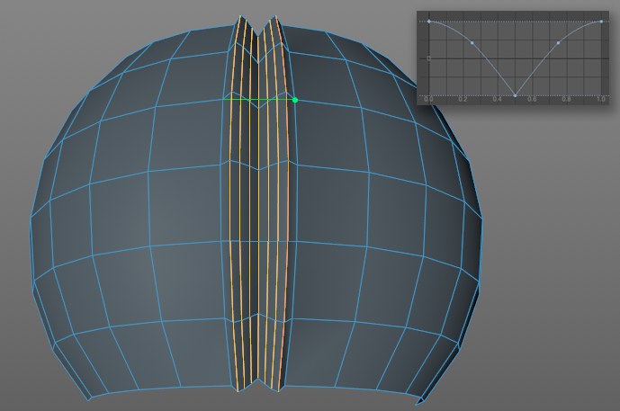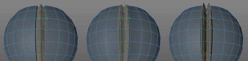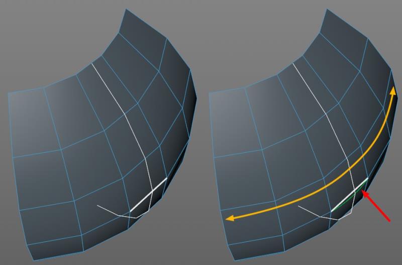 Stellen Sie sich vor, Sie wollen einen Loop-Schnitt in eine Kugel schneiden. Ist die Option deaktiviert, ergibt sich ein Schnitt wie links gezeigt: der Schnitt befindet sich auf der gleichen Ebene wie die benachbarten Kanten. Nicht unbedingt das, was man sich für eine Kugel vorstellt. Aktivieren Sie die Option und der Schnitt beachtet die benachbarten Krümmungen, was in obigem Fall auf eine Herauswölbung (grüne Linie) der Schnittkante herausläuft. Wie stark die Herauswölbung berechnet werden soll, regulieren Sie mit dem Parameter Spannung. Mit negativen Werten können Sie die Wölbung in die entgegengesetzte Richtung bewegen.