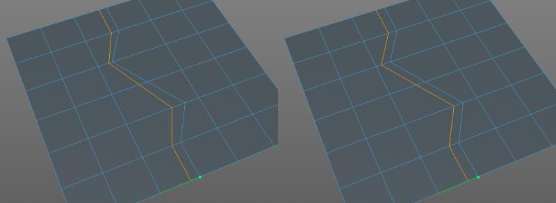 Ohne Polygon- oder Kantenselektion funktioniert das Werkzeug wie im Loop-Modus. Legen Sie dagegen vorher einen zusammenhängenden Selektionspfad an, versucht das Werkzeug (wieder ausgehend von der Kante unter dem Cursor), diesem Pfad zu folgen.