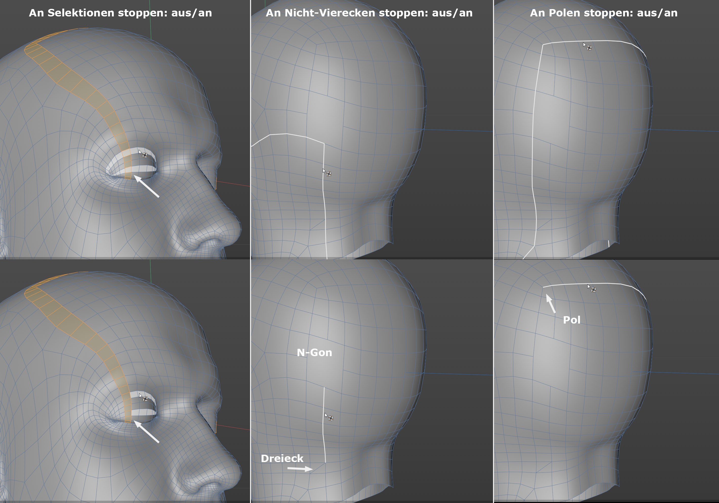 Diese Option arbeitet nur im Punkte- und Kantenmodus und lässt Loop-Selektionen an Dreiecken und N-Gons stoppen