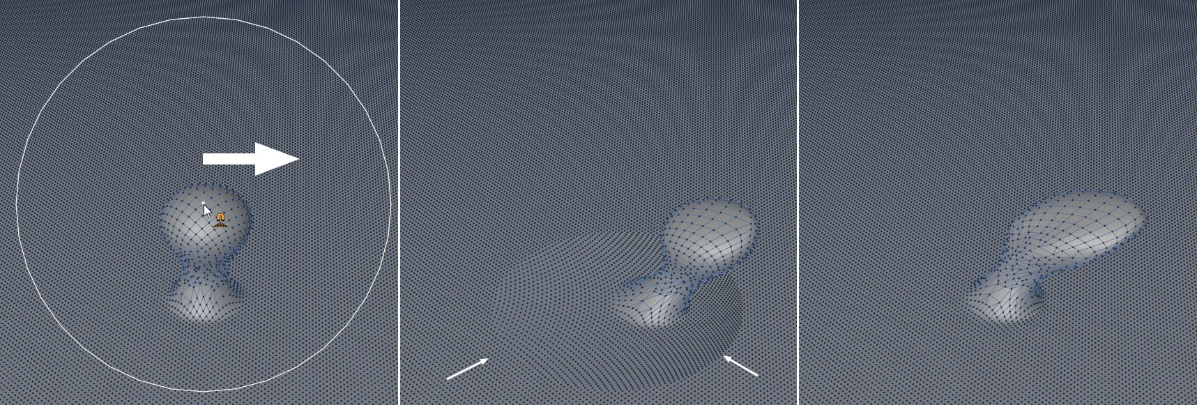 Möchten Sie den Werkzeugeinflussbereich nicht ausschließlich der im Editor eingeblendeten Kugel überlassen, sondern die um den Werkzeugwirkpunkt befindliche Oberfläche berücksichtigen, so aktivieren Sie diese Option. In obiger Abbildung sehen Sie wie in der Mitte Teile der Ebene mit verschoben werden, weil diese im Einflussbereich der links sichtbaren Werkzeugvorschau liegen. Rechts hingegen orientiert sich das Werkzeug an der Oberfläche, womit sich filigrane Objektbereiche besser bearbeiten lassen.