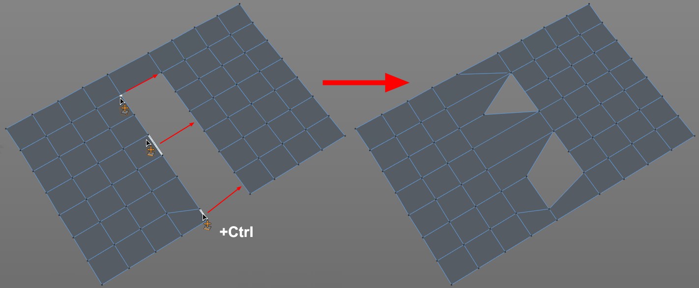 Durch Anklicken zweier Punkte, die Bestandteile einer Randkante sind, wird ein Polygon aus der Randkante und der zwischen diesen beiden Punkten liegenden Fläche gebildet (das funktioniert nicht im Polygonmodus):