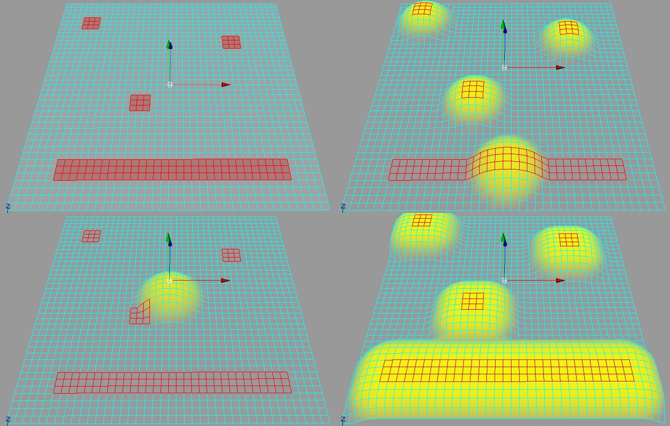 Die Funktionalität dieser Option lässt sich schwer im Bild festhalten. Selektieren Sie einige Polygone, aktivieren Sie die Option und verschieben, skalieren oder drehen Sie die Polygone hin und her. Sie werden feststellen, dass sich die Änderungen auf eine gewisse Art dynamisch innerhalb des Radiuses fortpflanzen. Achten Sie darauf, dass Sie unter Stärke eher kleinere Werte definieren.