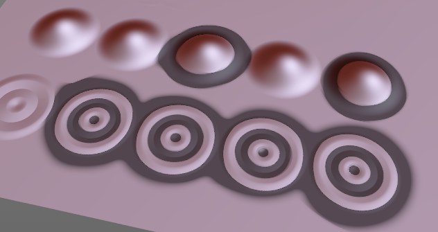 Die folgenden Modi funktionieren sinngemäß so: Sie geben zunächst ohne Pinselwirkung eine Form (die sich im übrigen nicht ausschließlich auf dem zu formenden Objekt befinden muss) vor, die erst in einem zweiten Schritt mit dem Pinsel nachgezogen wird (s. Abbild oben, rechts). Es funktionieren dabei folgende Bedienungsweisen: